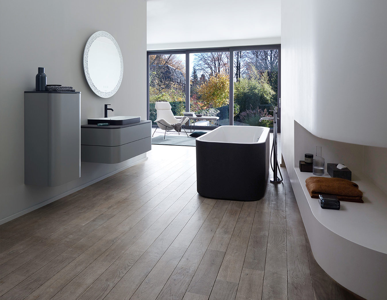 The circle and the open oval geometric elements that typify the design of Happy D.2 Plus are supported by the two-tone coloring of the above-counter basins in Anthracite Matt/ White and the bathtub with its external paneling in Graphite Super Matt.
